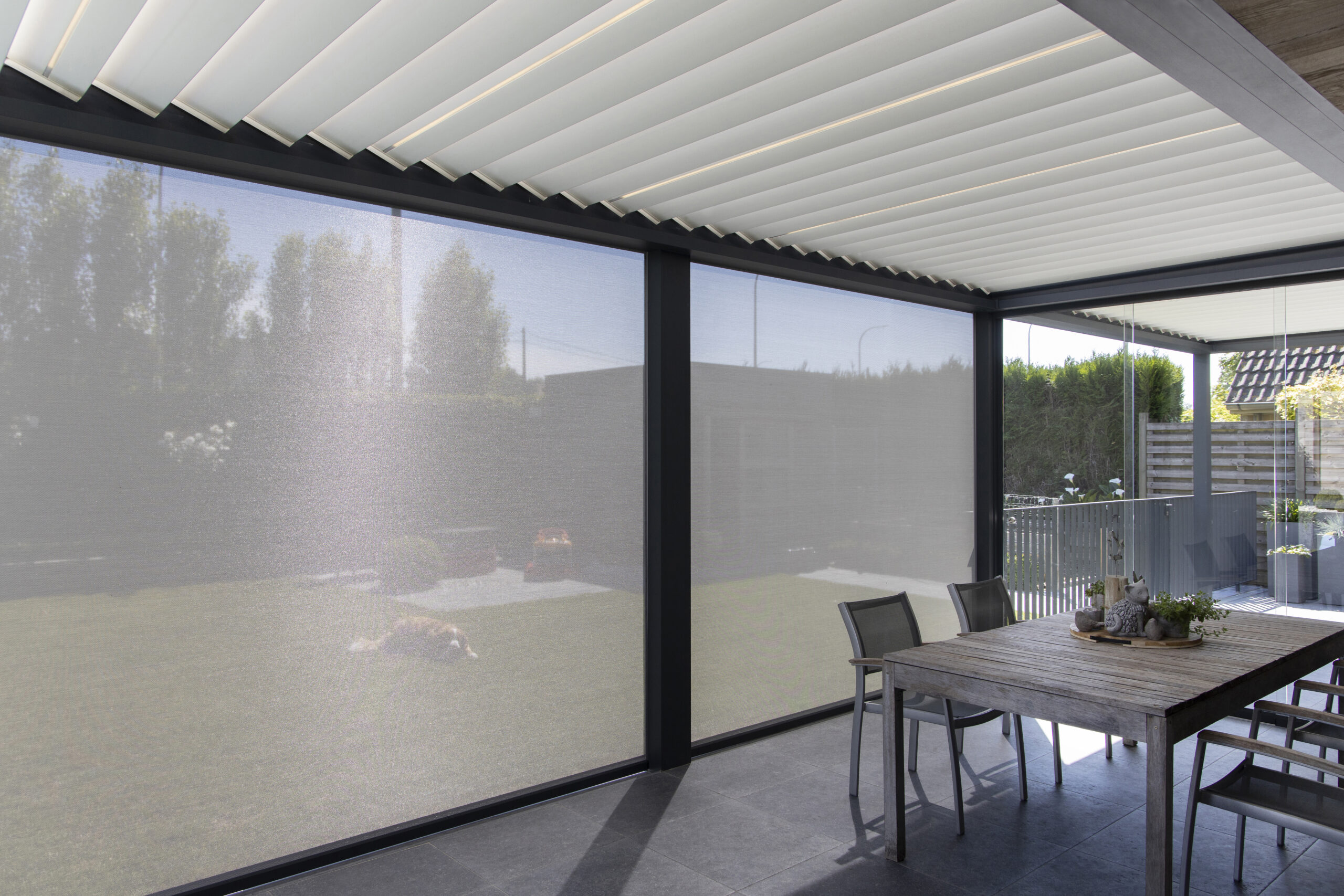 Senkrechtbeschattung mit ZIP-Screens verbindet effektiven Sonnen- und Hitzeschutz mit diskreter Privatsphäre – transparent nach außen, blickgeschützt nach innen.